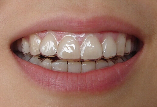 先,医生在我上下牙分别粘了三颗牙的胶,涂上去的是蓝色的啊,不知道为什么现在是透明的。